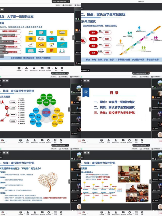 讲座伊始,冯蓉老师围绕进入大学的理念、挑战、协作三个方面展开讲解,和家长分享了在大学的新环境、新特点、新任务、新挑战,家长和学校应携手共进,为学生的健康成长保驾护航。冯蓉老师首先分享了初入大学,应及时做好身份调整和思维转变,注重科学文化素质、思想道德素质与身心健康素质协调发展,以逐步实现独立,增长知识技能,为未来人生做准备。随后冯蓉老师以现实咨询个案入手,讲解了家长和学生在大学期间常见的困惑与挑战。冯蓉老师指出,家长应适应新的家庭生命周期,调整生活模式,解决“分离”焦虑,学会“放手”,做到多尊重少控制、多支持少干涉、多信任少焦虑。最后,冯蓉老师指出家长面对孩子成长带来的变化,应采取合理的应对措施,希望家长相信辅导员、书院和学校,一起携手为孩子在大学成长过程中解决问题、克服困难、健康成长。学校积极心理体验中心也随时为学生提供专业咨询服务。书院、学校愿和家长一起,为学生的成长保驾护航,促进学生健康发展、顺利成才。