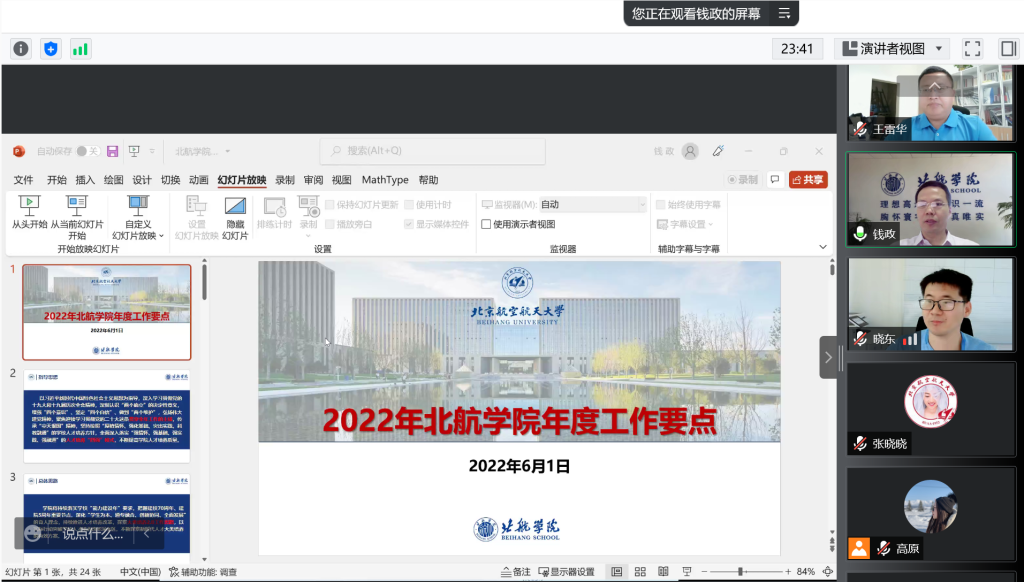 (通讯员 张芳芳 高原)为进一步凝心聚力,推动学院高质量发展,2022年6月1日,北航学院开展全院大会暨全面从严治党工作部署会,部署学院近期以及年度重点工作。学院党委书记宋晓东、院长钱政、其他领导班子成员等学院全体教职工共计110余人以线上方式参加会议。
