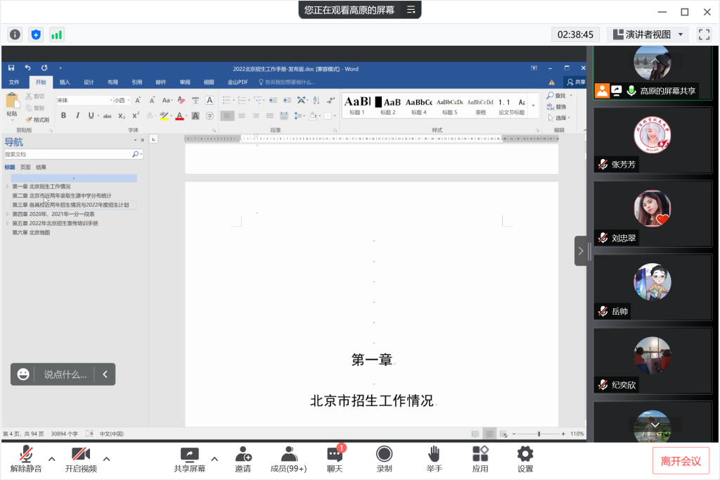 学院党政办副主任高原对2022年北航北京招生工作手册进行了介绍。她主要从北京招生工作情况、北京市近两年录取生源中学分布统计、各高校近两年招生情况、2020、2021年一分一段表、2022年北京招生宣传培训手册、北京地图等五方面对手册具体内容展开了详细介绍。