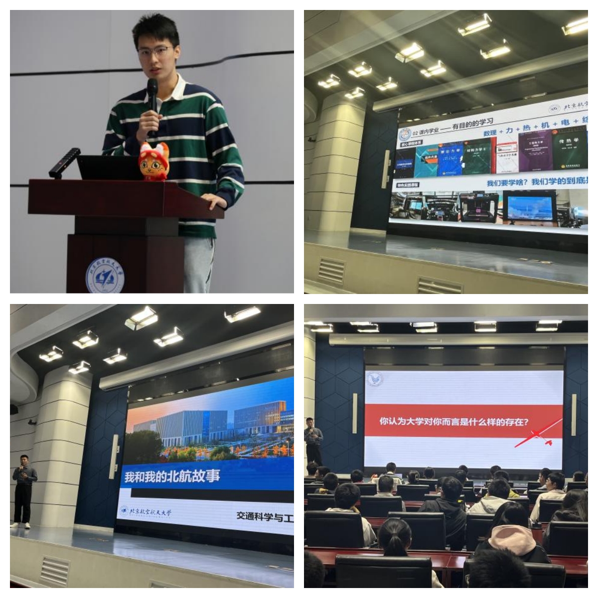 纪鑫以“我和我的北航故事”为题与大家交流。他以时间为轴,讲述了自己的大学经历:大一阶段初步探索,不断尝试,广泛涉猎,明确“我是谁”,进行深入的自我剖析;大二阶段坚定目标,积极参与学生工作,不断积攒科研成果,确定未来行进方向;大三阶段不忘初心,接续奋斗成为生活常态;大四阶段担任兼职辅导员工作,用热情感染更多人,希望更多同学能够将北航空天报国的精神薪火相传。他强调,专业选择的重要性不可忽视。理性的专业选择不仅决定了一个人的职业发展方向,也直接影响着在大学的学习态度、学习成果和成长规划。