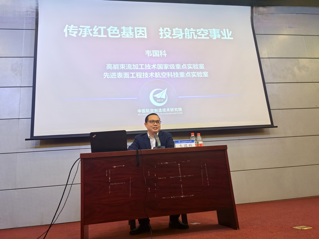 随后,为拓宽同学们对航空航天领域的认识,他从人才队伍、技术体系、制造技术等多个维度介绍了中国航空制造技术研究院的相关情况。同时,韦国科以自身从事的表面工程技术为主题,用深入浅出的语言、生动详实的事例,讲述了表面工程技术的重要地位、实际应用与发展趋势。他强调表面工程技术是21世纪工业发展关键技术之一,涵盖着复杂的技术架构,联结着战略性需求牵引。为此,我们必须抓住表面改性、薄膜/涂层、微纳加工三大应用抓手,把握复合化、绿色化、智能化、极端化发展趋势,努力提高相关理论和应用技术水平。