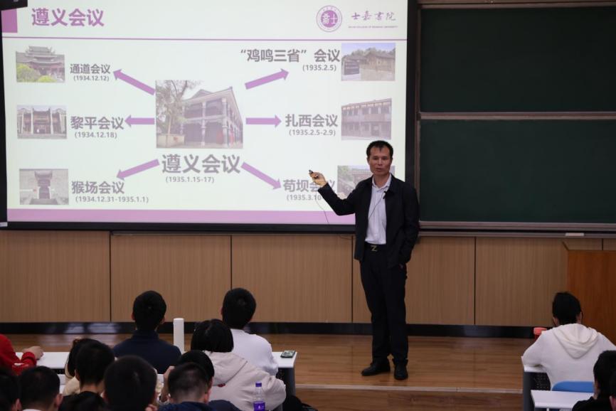 士嘉书院团委书记申永超带领大家学习了遵义会议精神,介绍了红军长征中从湘江战役到遵义会议的奋斗历程,鼓励同学们深入学习党史,传承红色基因,走好新时代的长征路,为实现中华民族伟大复兴贡献力量。