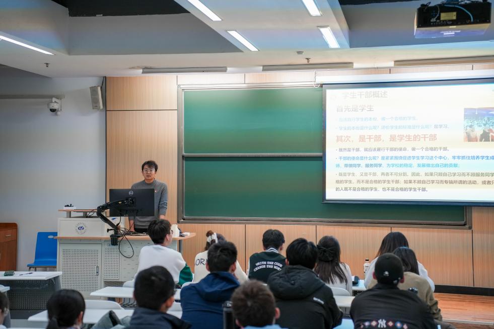 之后,传源书院团委书记李洋老师为全体班委进行学生干部能力提升培训,从学生干部的定位、职责和发展方向等方面进行了全面讲解。李洋老师指出学生干部首先是“学生”,要注重自己的学业,其次是“干部”,要将服务同学放在第一位,并向所有班委提出了殷切期望,希望大家砥砺奋进,不断总结学习,真正肩负起学生干部的使命和担当。
