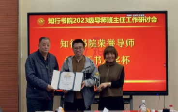 随后,举行了知行书院荣誉导师颁奖仪式,根据知行书院制度,在书院工作满五年的导师,会获得知行书院荣誉导师(一星)称号,每满五年加一星,本年度获得知行书院荣誉导师(一星)称号的是来自人文公管学院的李跟强老师,郑晓齐院长和沈映春老师分别为李跟强老师颁发了证书及奖杯。李跟强老师分享了自己在导师工作中的经验和感受,他强调导学工作应紧密结合学生需求,助力学生实现从高中到大学思维模式的转变,促进其全面发展。