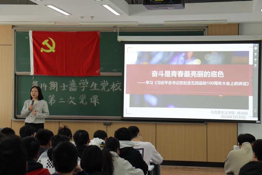 (通讯员 蒋言)3月30日下午,第14期士嘉学生党校第二次党课在沙河校区教4-201举行,马克思主义学院徐冶琼老师做题为《奋斗是青春最亮丽的底色——学习<习近平总书记在纪念五四运动100周年大会上的讲话>》专题党课,士嘉书院、冯如书院80余名入党积极分子参加了本次学习。