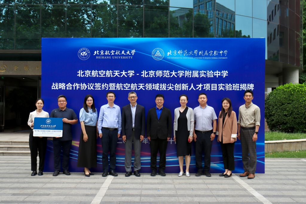 刘虎与孙兆前代表双方学校签署《北京伊人99—北京师范大学附属实验中学战略合作协议》,刘睿与孙兆前共同为“北京伊人99—北京师范大学附属实验中学创新人才实验班”揭牌。双方本着“优势互补、合作共赢、人才共育”的原则,整合各自优势资源,创新高校与中学联合人才培养模式,将大学航空航天特色和中学人才培养需求有机衔接,在科技创新实践、拔尖创新人才培养等方面深度融合、双向奔赴,为实现拔尖创新人才大-中贯通培养探索新途径新模式,为建设教育强国、科技强国和人才强国作出更多更大的贡献。