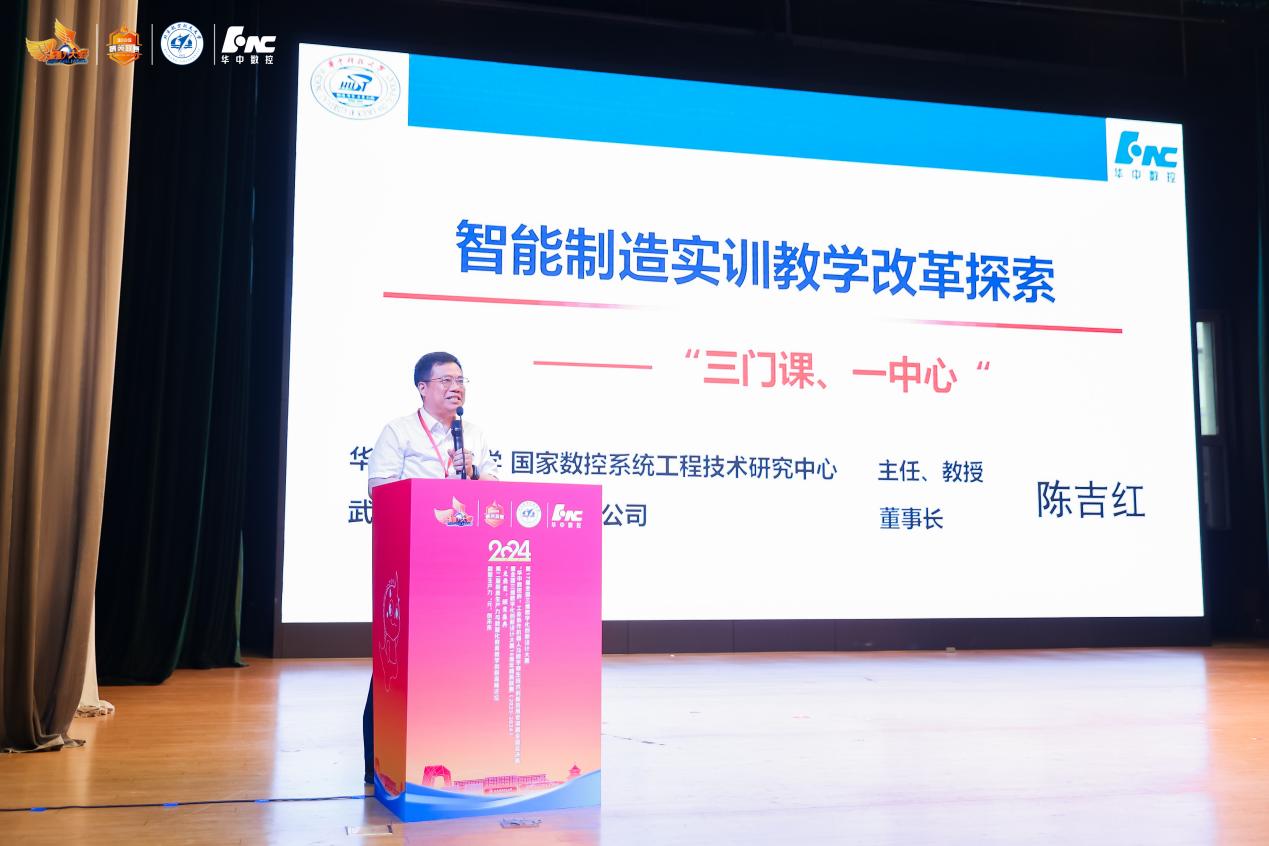 国家智能设计与数控技术创新中心副主任、国家数控系统工程技术研究中心主任、武汉华中数控股份有限公司董事长陈吉红作《智能制造实训教学改革探索》报告。他指出人才是加快形成新质生产力的原动力,华中数控三十余年坚持与华中科技大学产学研用深度融合,依托华中数控在工业市场自主创新的技术优势和应用验证优势,践行“三门课、一中心”的培养理念,在数控系统和高端智能装备产业人才的培养中,华中数控始终以先行者的姿态投身其中,支持教育事业,支持国家的科技创新战略,推动中国制造业从世界制造业价值链的中低端迈向中高端。