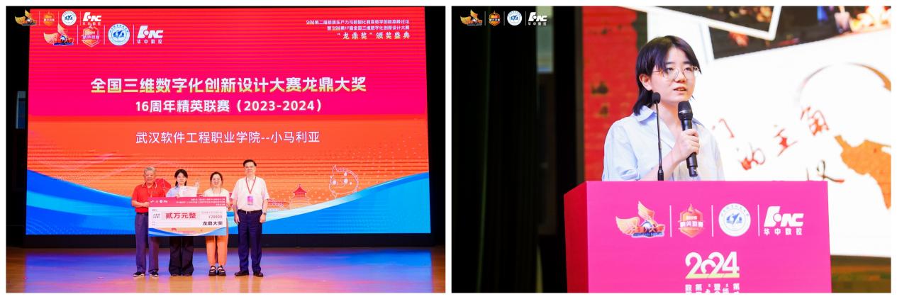此外还进行了全国三维数字化创新设计大赛16周年精英联赛(2023-2024)龙鼎大奖颁奖仪式,来自武汉软件工程职业学院的“小马利亚”小队摘获16周年精英联赛“龙鼎奖”桂冠,并在现场进行比赛创意分享。