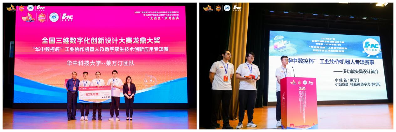 经过全国专家委员会的评选,华中科技大学机械科学与工程学院“莱万汀”小队摘得华中数控杯“龙鼎奖”桂冠。三位同学现场分享了他们团队的创新思路和工业机器人末端夹具完善历程,展示了当代大学生不断探索和创新的精神。