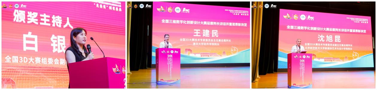 高峰论坛结束后,大会第二阶段进行了全国3D大赛“龙鼎奖”颁奖盛典,全国3D大赛技术专家委员会副主任兼总裁判长、清华大学软件学院院长王建民,全国3D大赛技术专家委员会副主任兼总裁判长、北航新媒体艺术与设计学院院长、美育中心主任沈旭昆分别宣布了获奖表彰结果,全国3D大赛“龙鼎奖”颁奖盛典由全国3D大赛组委会副秘书长白银主持。