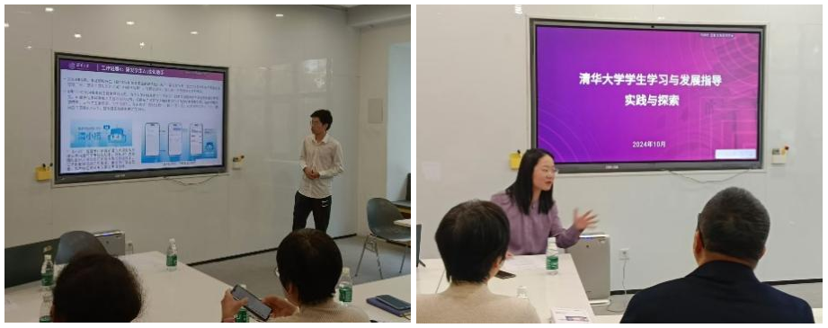 18日上午士谔书院执行院长丁丁一行3人、北京工业大学学业指导中心办公室主任韩天玉一行3人、深圳职业技术大学学生处处长王敏坚一行6人前往清华大学学生学习与发展指导中心进行调研。中心副主任詹逸思老师首先对清华大学学生学业支持工作进行了整体概括,之后由邬丰骏老师对学生学习与发展指导中心工作体系以及目前重点工作进行了介绍,重点介绍了AI+促进学生发展的创新。随后,与会人员就AI与学业支持工作的结合以及清华目前学业支持工作体系进行深入交流。会后,一行人参观了清华大学“一站式”学生社区。