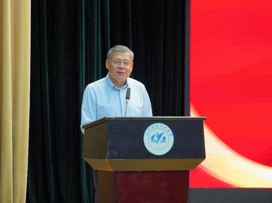 致真书院院长刘志新在启航礼上讲话。刘志新对197名问天者表示热烈的欢迎和衷心的祝贺。他介绍了九三阅兵中“大国重器”背后彰显的北航力量,并希望同学们弘扬“家文化”,营造互助氛围,同行携手成长,收获满满的认同感、幸福感和使命感;传承“好学风”,深化专业认知,夯实数理基础,筑牢学术成长和科研启航的根基;凝聚“正气旋”,厚植家国情怀,锚定发展向位,将个人理想融入中国式现代化的宏伟蓝图。