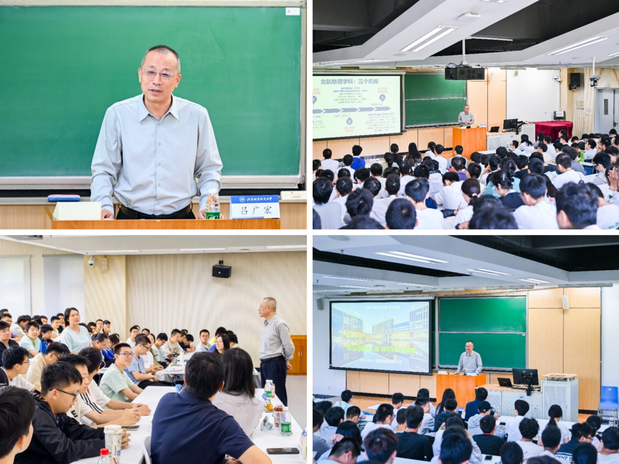 理科大类开展物理学院专业宣讲。物理学院院长吕广宏老师主讲《青山尽解招人醉 得失到头皆物理》院长讲坛,从学科历史沿革、学科定位与发展现状、物理教学与人才培养、学科未来展望四个方面,全面系统地介绍了物理学院的基本情况和培养特色,展现了北航物理学科的优势实力,体现了“尚德务实、求真拓新、追求卓越、甘于奉献”的学院精神传承。