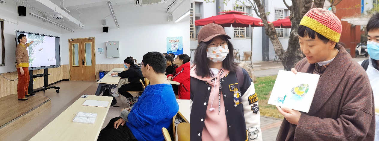 “手绘春之美”美育兴趣课堂包含室内理论和室外实践两部分。理论环节讲述了绘画的构图要素与色彩搭配,结合书院提供的水彩、彩铅等绘画工具讲解其特性和使用方法。实践环节组织学生踏访学院路校区,绘制心中最美的风景。指导教师对每一位同学的手绘画作进行了点评。