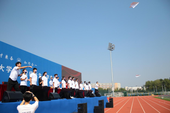 仪式上,领导老师们为新生代表佩戴书院院徽,象征着一代代北航人使命与担当的薪火相传。最后,两位新生带领全部学生一起高喊“以梦为马,不负韶华,信之所向,在此启航”,并放飞代表象征着梦想与传承的纸飞机。
