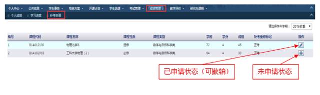 在系统具体操作按钮见图中红笔标出位置处,选择需要申请补考的课程,点击相应图标即可。在规定的补考申请时间内,学生可自行申请或撤销补考,逾期无法办理。